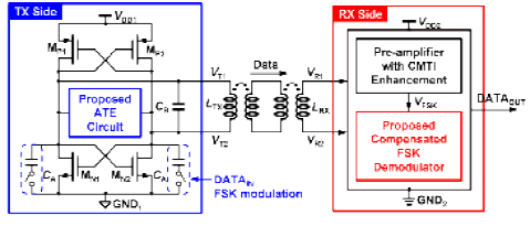 用于隔离式栅极驱动的数字隔离器因其能够有效抑制CMT干扰,成为GaN功率管隔离栅极驱动的重要研究方向。然而,在传统设计中存在两大问题:一、采用传统频移键控(FSK)解调器会引起数据符号持续时间不等,从而进一步导致功率器件直通电流或较大的反向导通损耗;二、传统测量中仅给出静态CMTI指标,即在测量的过程中假定传输速率为零,而面向真实场景的动态CMTI指标较为匮乏。